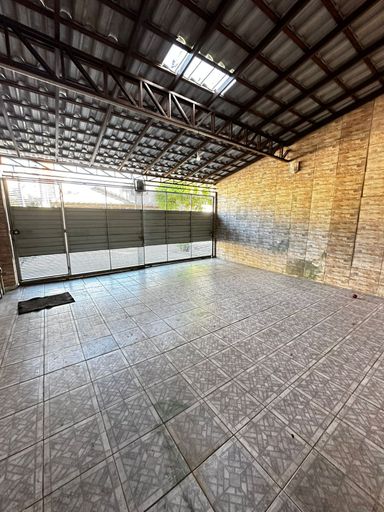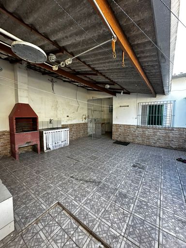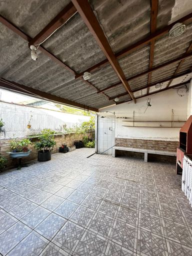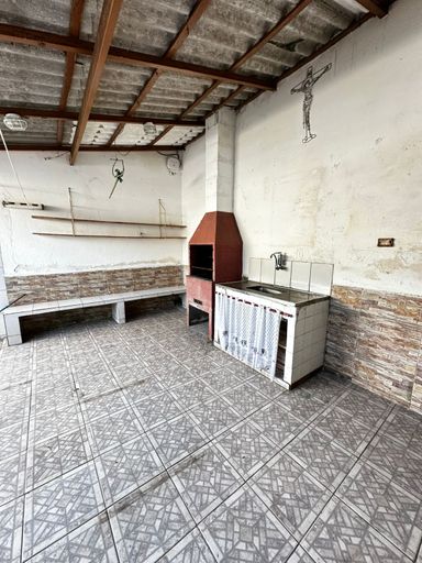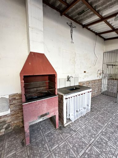 Área com churrasqueira e garagem para dois carros.
